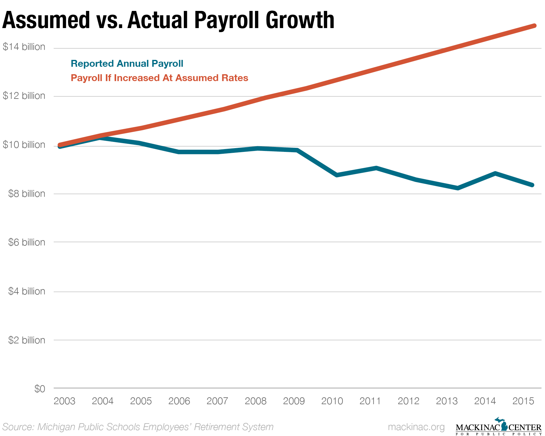 Determining how much needs to be invested in pension funds each year requires making certain assumptions about the future, and getting these wrong increases underfunding. One of the current assumptions is that school payrolls will grow, something that hasn't happened for years. In 2005, school payrolls totaled $10.2 billion; in 2015, payroll was down to $8.4 billion.
