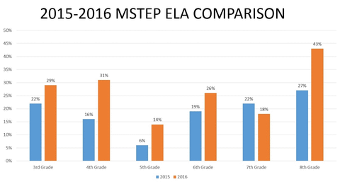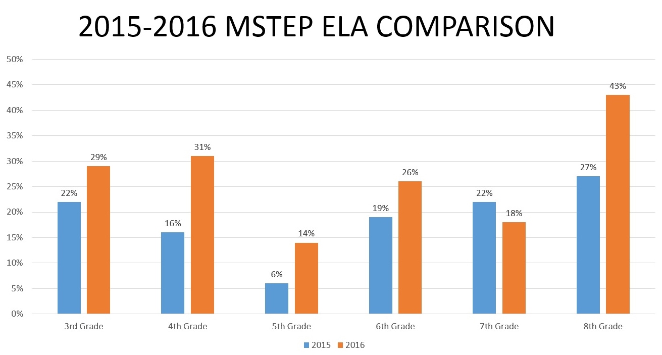 The fruits of focused hard work are evident on the school’s most recent round of M-STEP English tests, where nearly every group demonstrated significant increases. Proficiency rates doubled in fourth and fifth grade, with eighth-graders making their own dramatic growth.