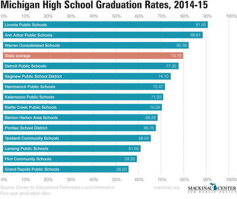 Michigan’s graduation rate was 79.8 percent in 2014-15, the highest rate in 10 years. The rate had been down to 74.3 percent in 2010-11 but has increased each year since.