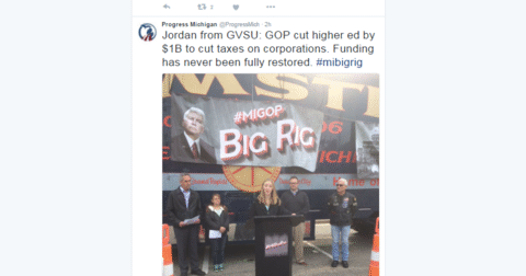 During its Grand Rapids stop, the group posted this on Twitter: “GOP cut higher ed by $1B to cut taxes on corporations. Funding has never been fully restored.”