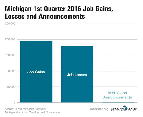 The efforts of these economic development programs only amount to a blip when considering the total amount of job creation that happens statewide. Over the same three-month period in which Michigan companies added nearly 200,000 jobs, the MEDC announced that it had awarded support to companies to create just 425 jobs.