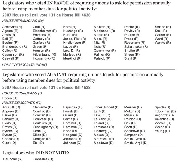 But even the modest gains already made toward paycheck protection in Michigan are under siege. A bill that would eliminate the requirement that employees affirm annually that they want paycheck deductions to go into a union PAC recently passed the Michigan House of Representatives on May 2, 2007, and awaits attention from the Senate. House Bill 4628, sponsored by State Rep. Fred Miller, D-Mount Clemens, would make several other changes to Michigan’s campaign finance laws. The bill was the subject of numerous amendments prior to its passage.