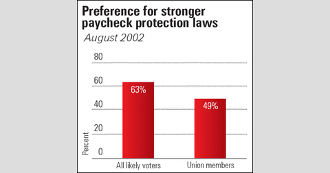 An August 2002 opinion poll commissioned by the Mackinac Center showed 63 percent support amongst likely voters for strengthening Michigan’s paycheck protection law so as to add the provisions that Mr. Hunter suggests. This poll also showed 49 percent support amongst voters who are members of unions.