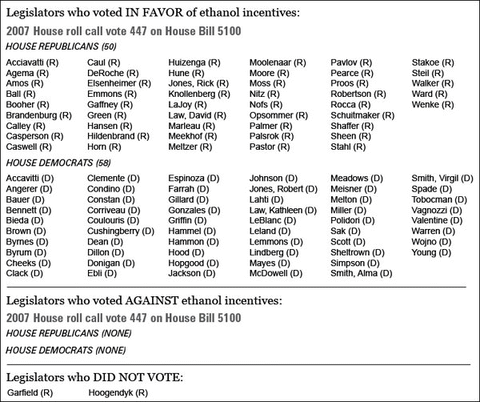 The MichiganVotes.org tally for the bill that authorizes tax breaks for ethanol production appears below.