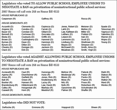 The MichiganVotes.org tally for the bill that would allow public school employee unions to bargain for a privatization ban is provided below.