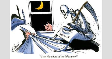 The modern tax revolt held a more muted capitol rally during the spring of 2007. Demonstrators wore stickers with the slogan "Recall 1983?" This event also featured the debut of "Mr. Perks," an eight-foot-tall, pink foam pig mounted atop a trailer. Property of Drolet and the Michigan Taxpayers Alliance, Perks has been used as an intimidating symbol of government largesse.