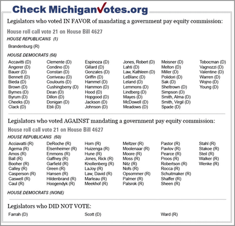 This was one of three pay equity bills written about in the November/December, 2007 Michigan Capitol Confidential: "Bills Would Put the State in Charge of Setting Private Salaries." Because the bills collectively have 49 co-sponsors and need only 56 votes to pass, the article rightly observed that the full House of Representatives might attempt to ratify some version of the pay equity concept.