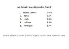 Since the end of the recession in June 2009 to November 2013, Michigan's 6.7 percent job growth (an additional 256,000 jobs) has only been surpassed by North Dakota (24 percent), Texas (9.6 percent), Utah (8.9 percent) and Indiana (7.6 percent). That's payroll jobs data from the U.S. Bureau of Labor Statistics.