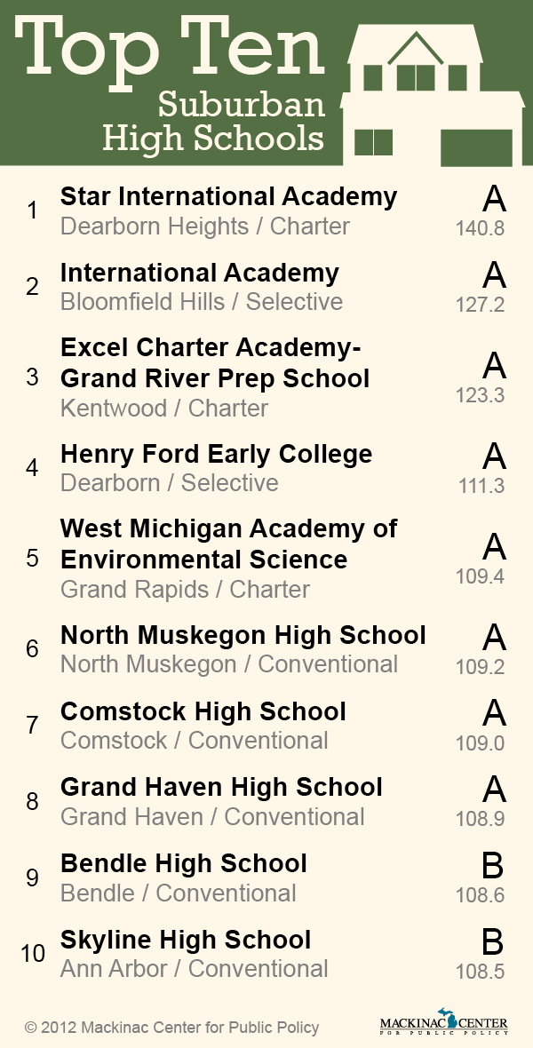 Below are lists of some of the top-performing schools on the report card, sorted by locale. To view the report card and explore the complete, searchable database, visit www.mackinac.org/CAP2013.