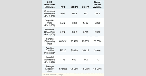 The accompanying graphic is reproduced from the Mercer Group’s case study of Indiana and shows several metrics for “healthcare utilization.” Compared to those in a traditional insurance plan (a preferred provider organization), Indiana state employees enrolled in the state’s two CDHPs experienced shorter hospital stays, fewer admissions, lower average costs for prescriptions and greater generic drug selection.