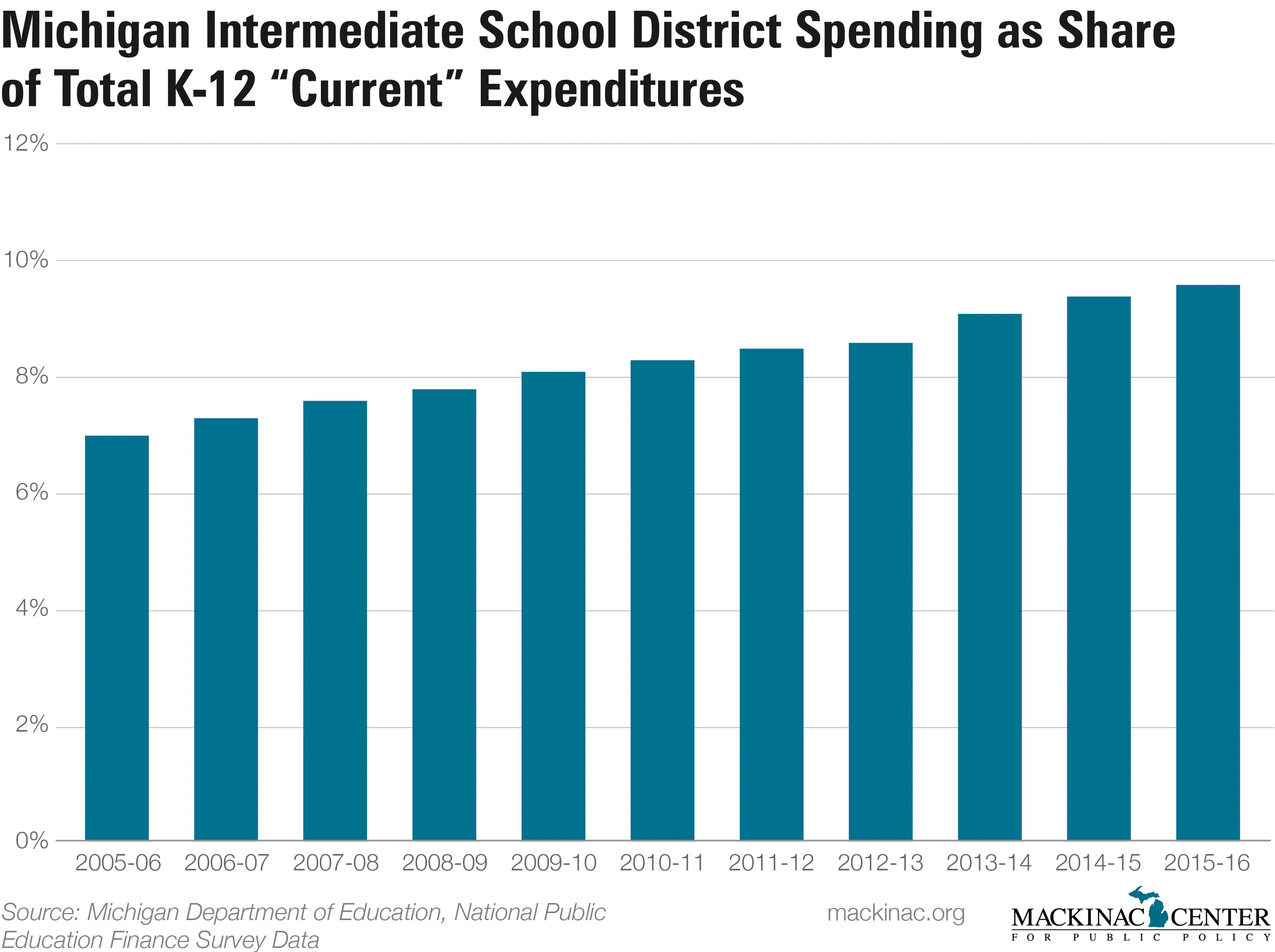 Though the benefits of direct, popular elections aren’t clear, what is clear is that ISD boards have been spending a greater share of Michigan’s public education dollars over the past decade or more. In 2005-06, ISDs spent 7 percent of all K-12 dollars statewide. Ten years later, their share of spending reached 9.5 percent. At the current rate of growth, ISDs will spend one of every 10 education dollars next school year.