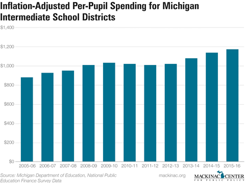 This trend is also seen in the actual dollars spent by ISDs. In 2015-16, ISDs reported spending $1,168 for each full-time Michigan pupil, a 33 percent increase from 10 years earlier, even after adjusting for inflation. And these figures do not include dollars that ISDs pass through to local school districts, an amount surpassing $1.06 billion last year.