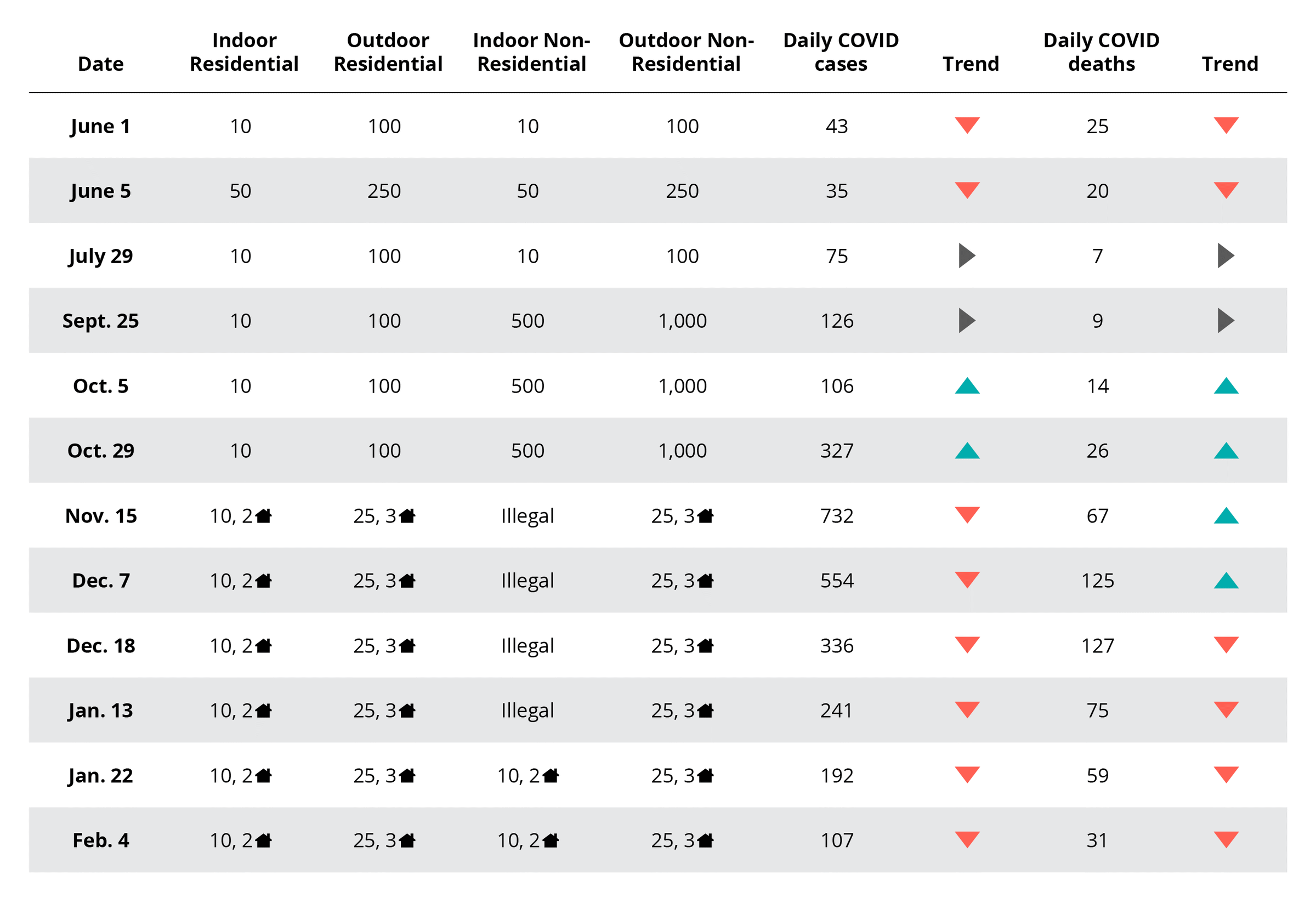 The table below shows the restrictions on social gatherings implemented since the stay-at-home order ended. It also lists the seven-day rolling average of daily positive COVID tests per million people and seven-day rolling average of daily COVID deaths on the day the orders were announced. These data are from the MI Safe Start Map as reported on Feb. 9. The house icon refers to the limit the governor imposed on how many different households are permitted to gather in the same space.