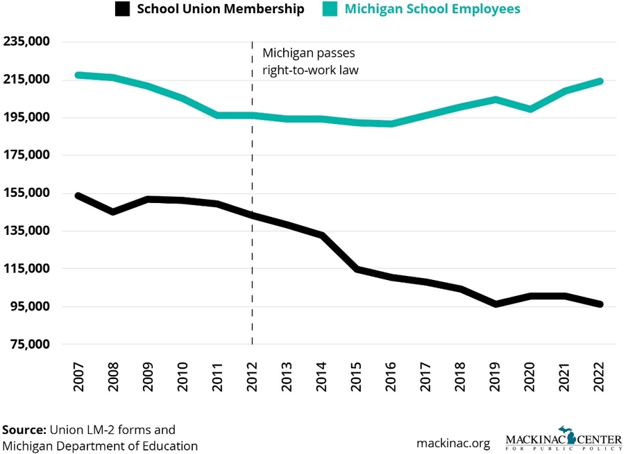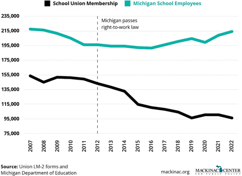 The total membership of both of Michigan’s teacher’s unions, the Michigan Education Association and the American Federation of Teachers Michigan, has dropped from about 145,000 in 2012 to 95,000 last year.