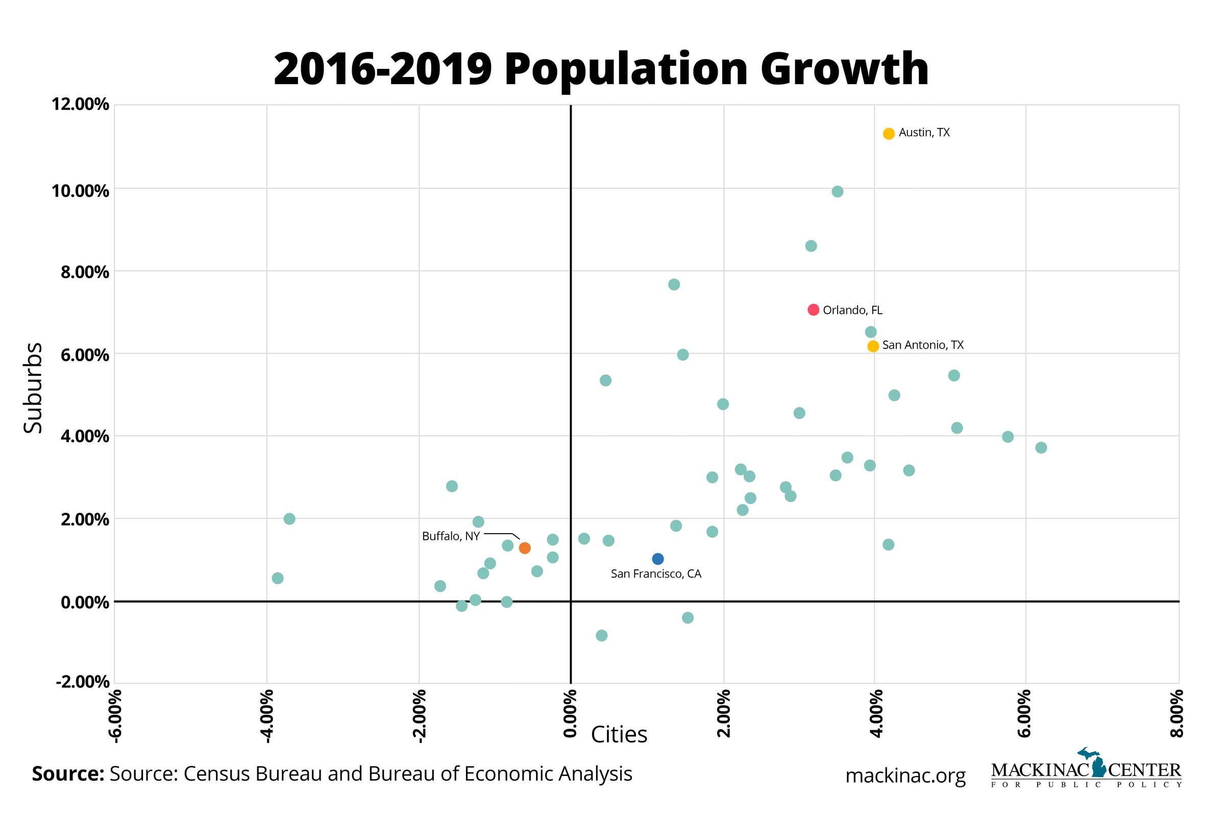 This is a chart of the 50 largest metropolitan statistical areas, comparing the growth of the main city and their suburbs from 2016 to 2019. Every metropolitan statistical area is a dot. How much the city grew is how far right the dot is, and how much the suburbs grew is how high the dot is.