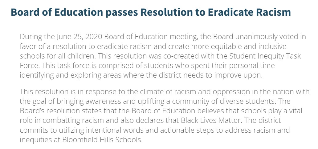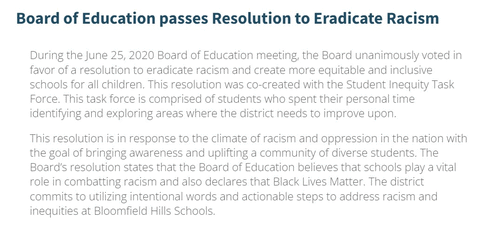 The Bloomfield Hills Public Schools Schools Board of Education passed a resolution in June 2020 to eradicate racism.