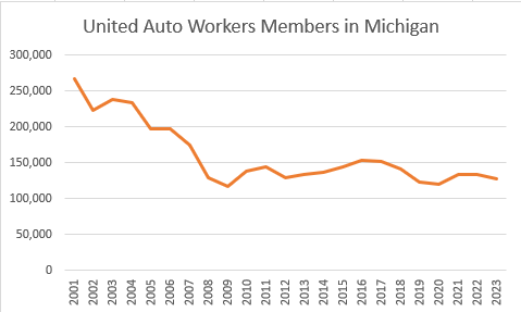 Membership numbers are even worse for the assorted UAW branches in Michigan. They lost about 6,500 members during the strike year and are now down to 127,458. That’s a 5% drop.