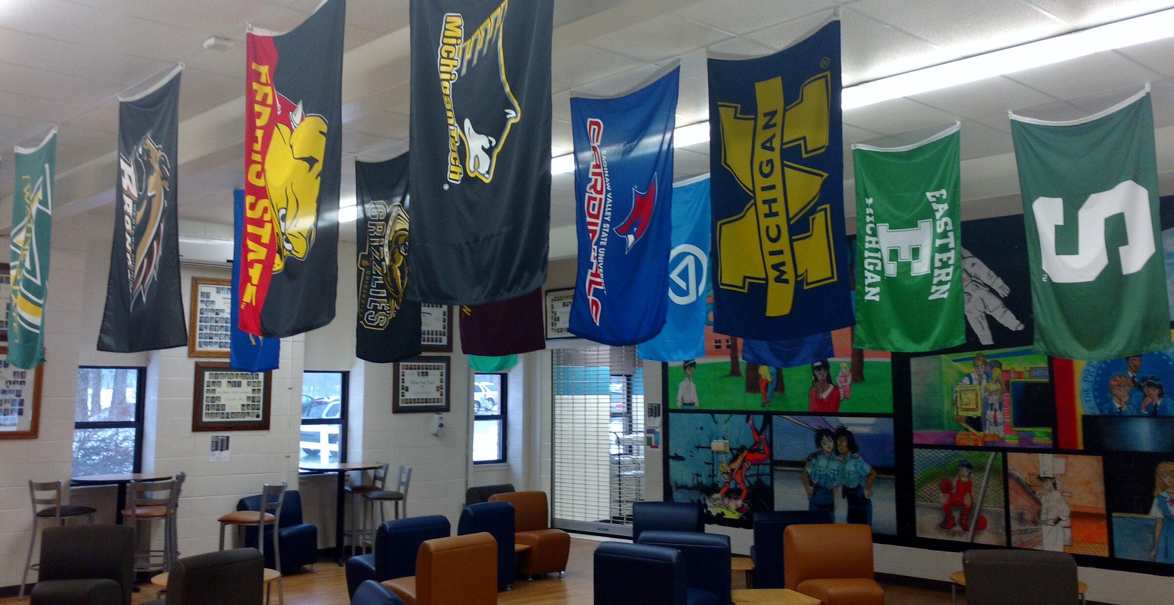 The district’s deep and relentless focus on demystifying and breaking down the barriers to college has raised the bar on academic expectations. The school regularly hosts on-campus events with different university representatives. The emphasis on postsecondary learning is obvious throughout campus, including the student commons area that prominently displays flags from many of Michigan’s colleges and universities.
