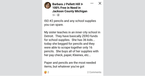 In one recent example, an individual claimed in a Facebook forum that her sister, who worked in an inner-city Detroit school, had 36 children in her class and had to beg for pencils. She could only, the individual claimed, scrap together 16.