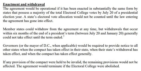 When states that hold 270 or more electoral votes join the compact, it will go live. The compact pledges those electoral votes to the candidate who win the popular vote nationally, as determined by participating secretaries of state — and regardless of the results in each particular state.