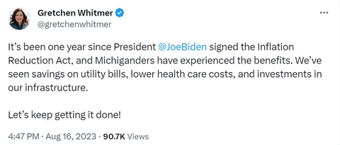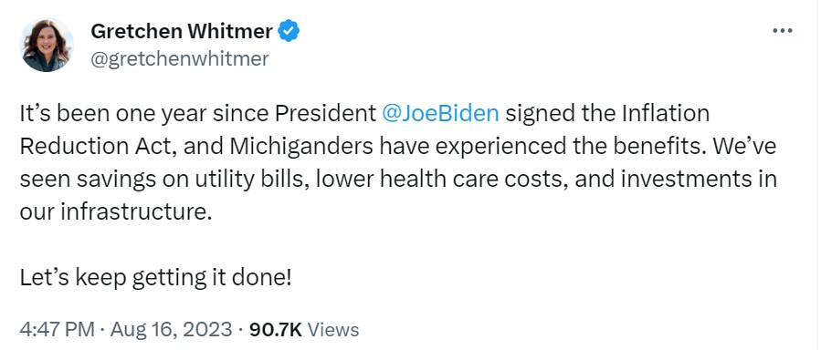 “It’s been one year since President @JoeBiden signed the Inflation Reduction Act, and Michiganders have experienced the benefits,” Whitmer tweeted Aug. 16. “We’ve seen savings on utility bills, lower health care costs, and investments in our infrastructure.”