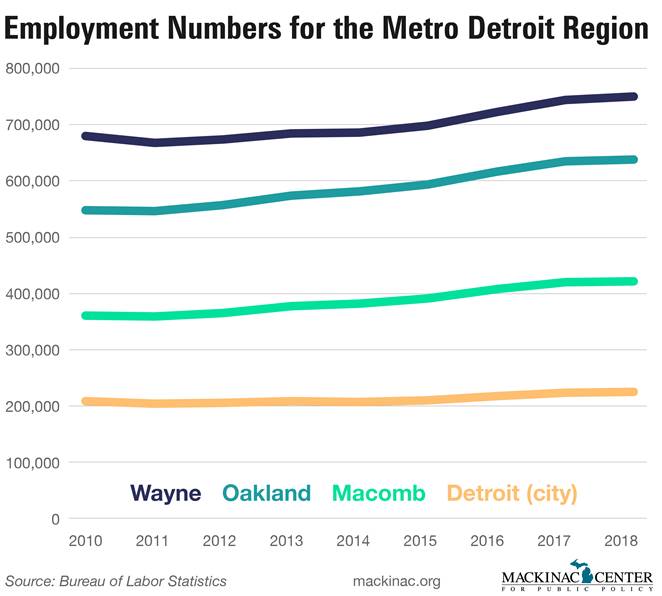 While Detroit’s long-promised revival has brought companies like Quicken Loans and Google from the suburbs, Detroit’s northern neighbors – Macomb and Oakland counties – have experienced substantial growth in the number of residents employed as well as in labor force and population.
