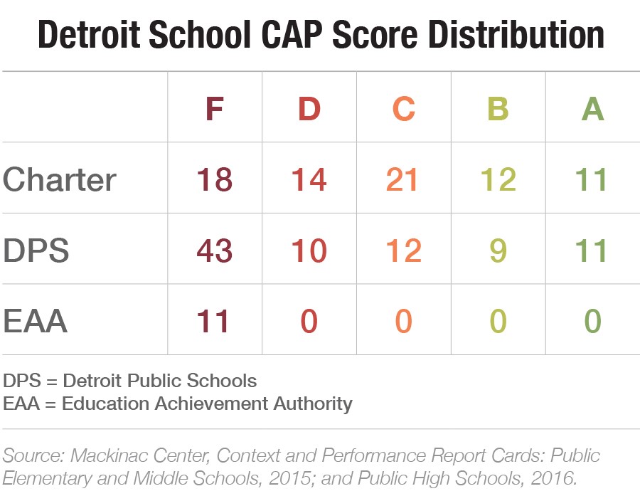 When measured by the 2015 elementary and middle school report card as well as the 2016 high school report card, the 76 Detroit charter schools earned an average CAP score of 99.16, just below the expected performance level. Roughly 30 percent earned an A or B, in line with state averages, while nearly 40 percent received a D or F.