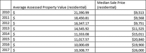 After decreasing every year between 2010 and 2016, the average assessed property value increased slightly between 2016 and 2017, going from $10,001 to $10,309.