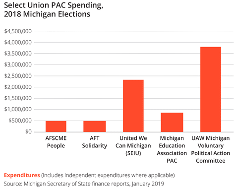 Unions and their affiliated political action committees continue to be big players in Michigan elections, spending a lot of money to influence candidate and ballot outcomes. The 2018 elections were no exception.