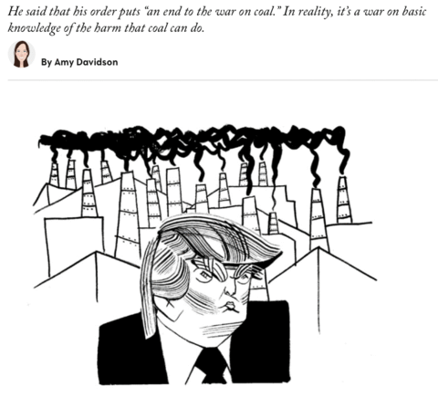 In an April 2, 2017, story by Amy Davidson titled “Trump v. The Earth,” the New Yorker magazine ran a cartoon. It featured a cartoon President Donald Trump standing in front of coal plant smoke stacks with black smoke emerging from them.
