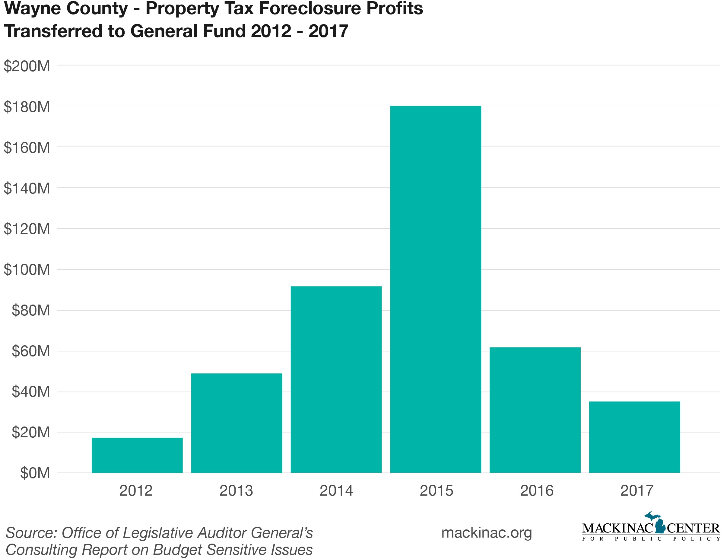 In 2015, Wayne County transferred $180.1 million in profits from property tax foreclosures to its general fund budget. The amount was sharply higher than the $91.6 million transferred the previous year, according to data in a state Auditor General report. In 2016, the county transferred $62 million.