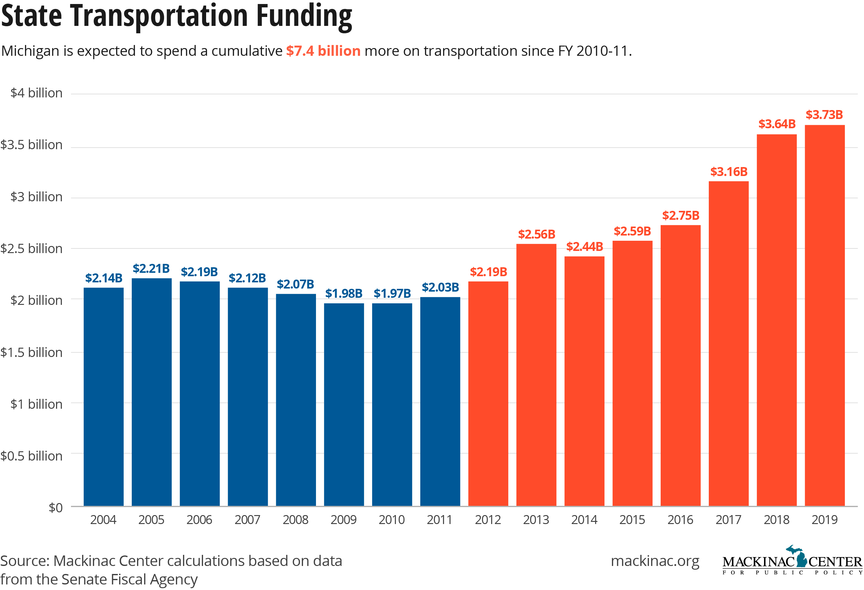 Michigan is projected to have increased transportation spending by a total of $7.4 billion in state funds over an eight-year period, according to the nonpartisan Senate Fiscal Agency.