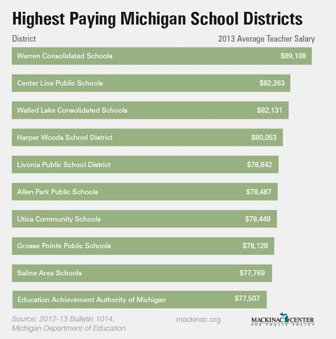 The average teacher salary in Michigan's top 10 highest paying districts for 2013 was over $81,000 per year. But there appears to be no correlation between higher paid educators and student outcomes.