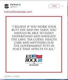 Kid Rock, whose real name is Robert James Ritchie, is considering a run as a Republican next year for the Michigan U.S. Senate seat currently held by Debbie Stabenow, a Democrat. Kid Rock recently announced his platform: “I believe if you work your butt off and pay taxes, you should be able to easily understand and navigate the laws, tax codes, health care and anything else the government puts in place that affects us all.”