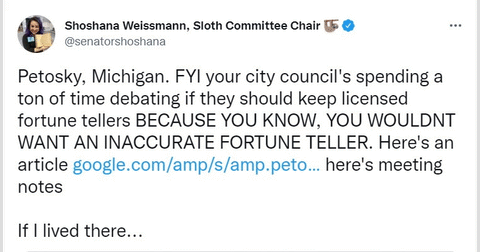 The city of Petoskey has banned fortunetelling since 2014. Its ordinance states: “It shall be unlawful for any person to engage in fortunetelling or pretend to tell fortunes for hire, gain, or reward.” Violators may be punished by jail (up to 93 days), a fine of $500, or both.