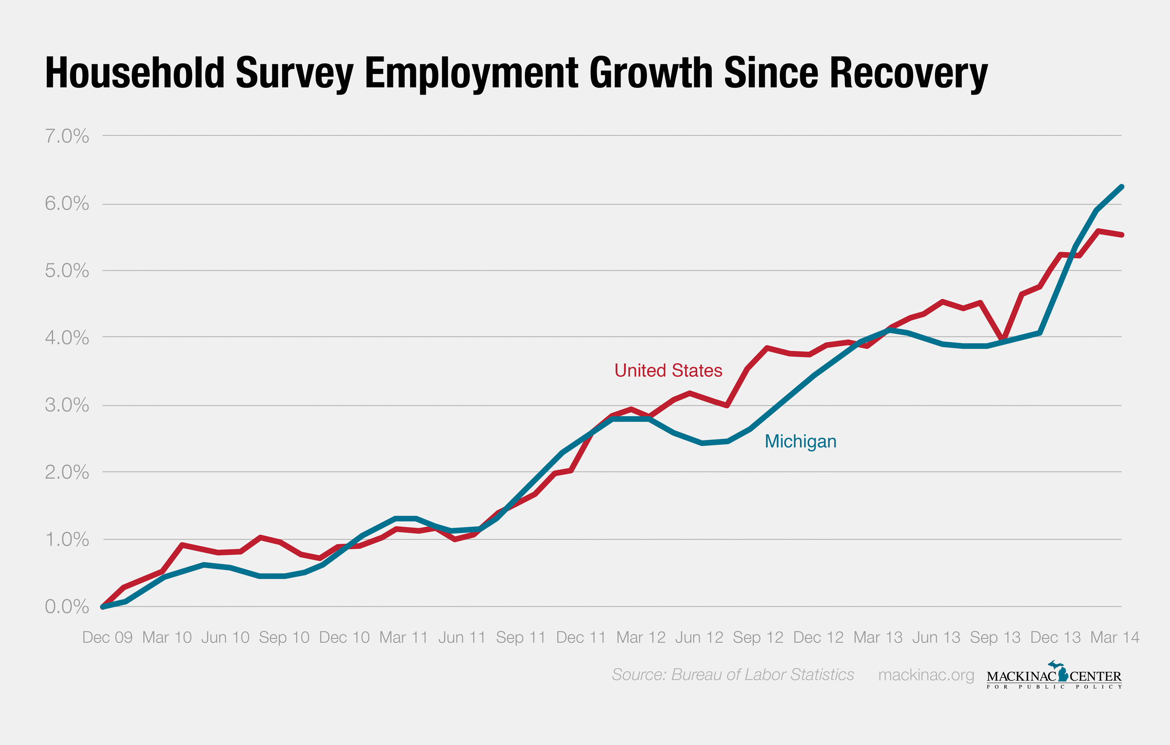With the household survey, Michigan had 4.130 million jobs in December 2009 while the U.S. had 138.013 million jobs. In the most recent data from April 2014, Michigan had 4.389 million jobs and the U.S. had 145.669 million jobs. That’s a 6.3 percent increase for Michigan and 5.5 percent increase from the U.S.