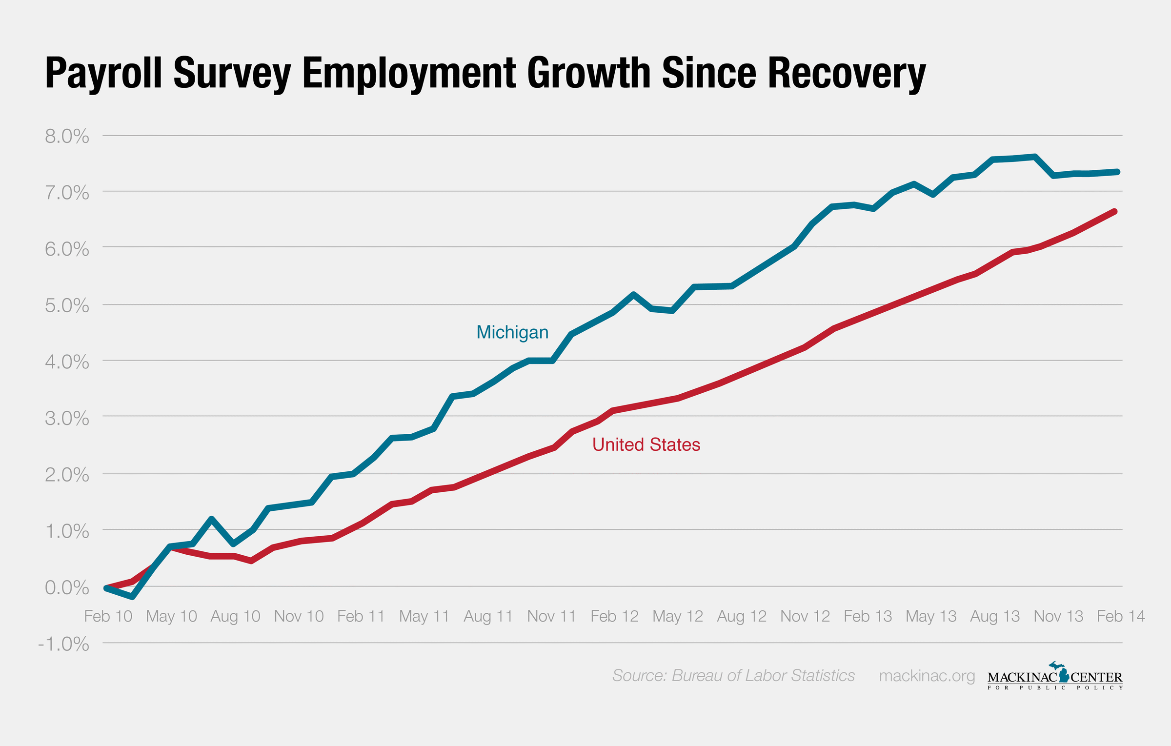 With the establishment survey, Michigan had 3.835 million jobs in February 2010 while the U.S. had 129.655 million jobs. In the most recent data from April 2014, Michigan had 4.116 million jobs while the U.S. had 138.252 jobs. That’s a 7.3 percent increase for Michigan and a 6.6 percent increase for the U.S.