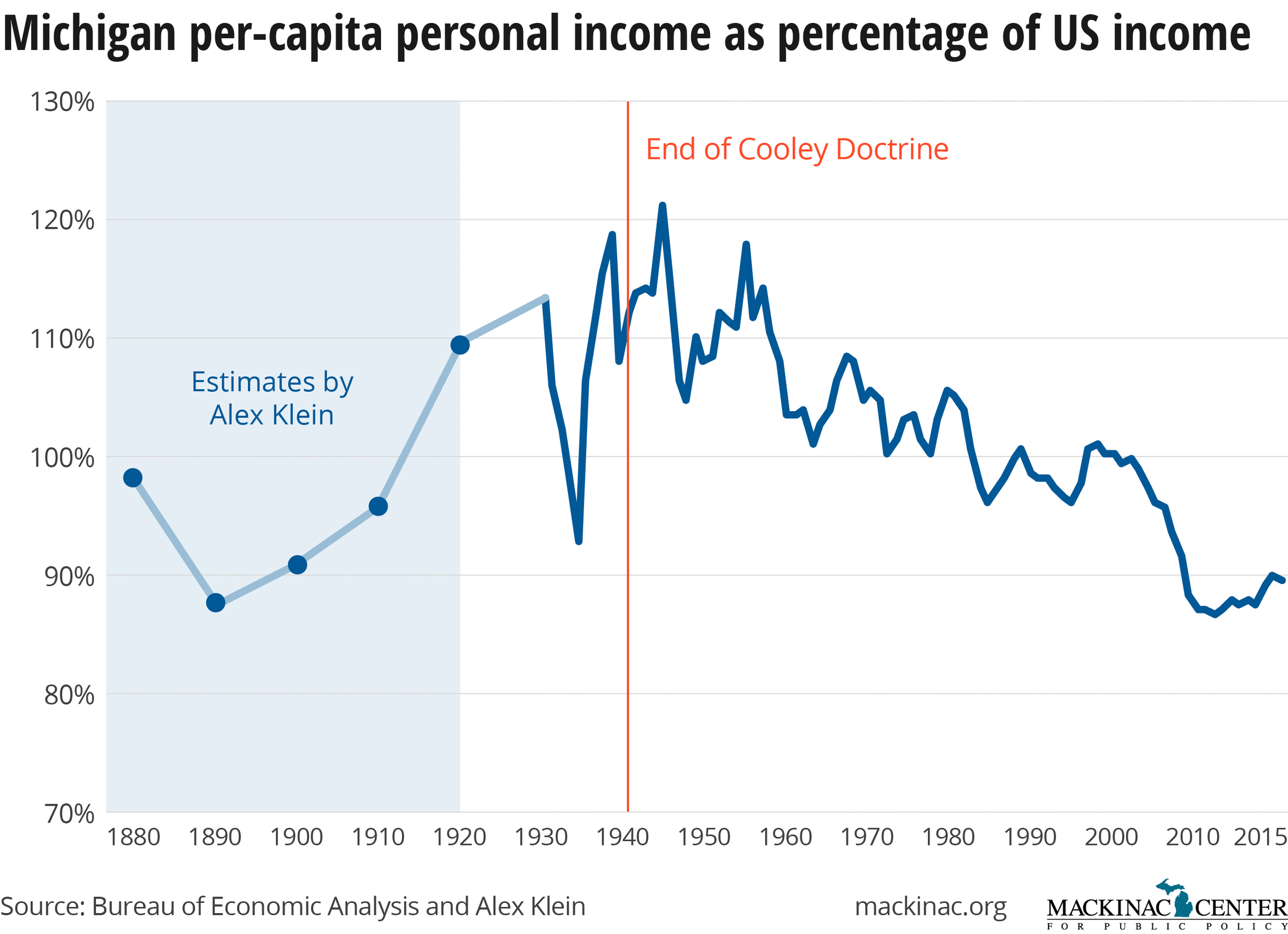 The average income in Michigan gained in relative position to other states when the state was prohibited from supporting private interests. State average income increased 382 percent from 1880 to 1941, and Michigan rose from being the state with the 21st-highest income to the state with the 12th-highest.