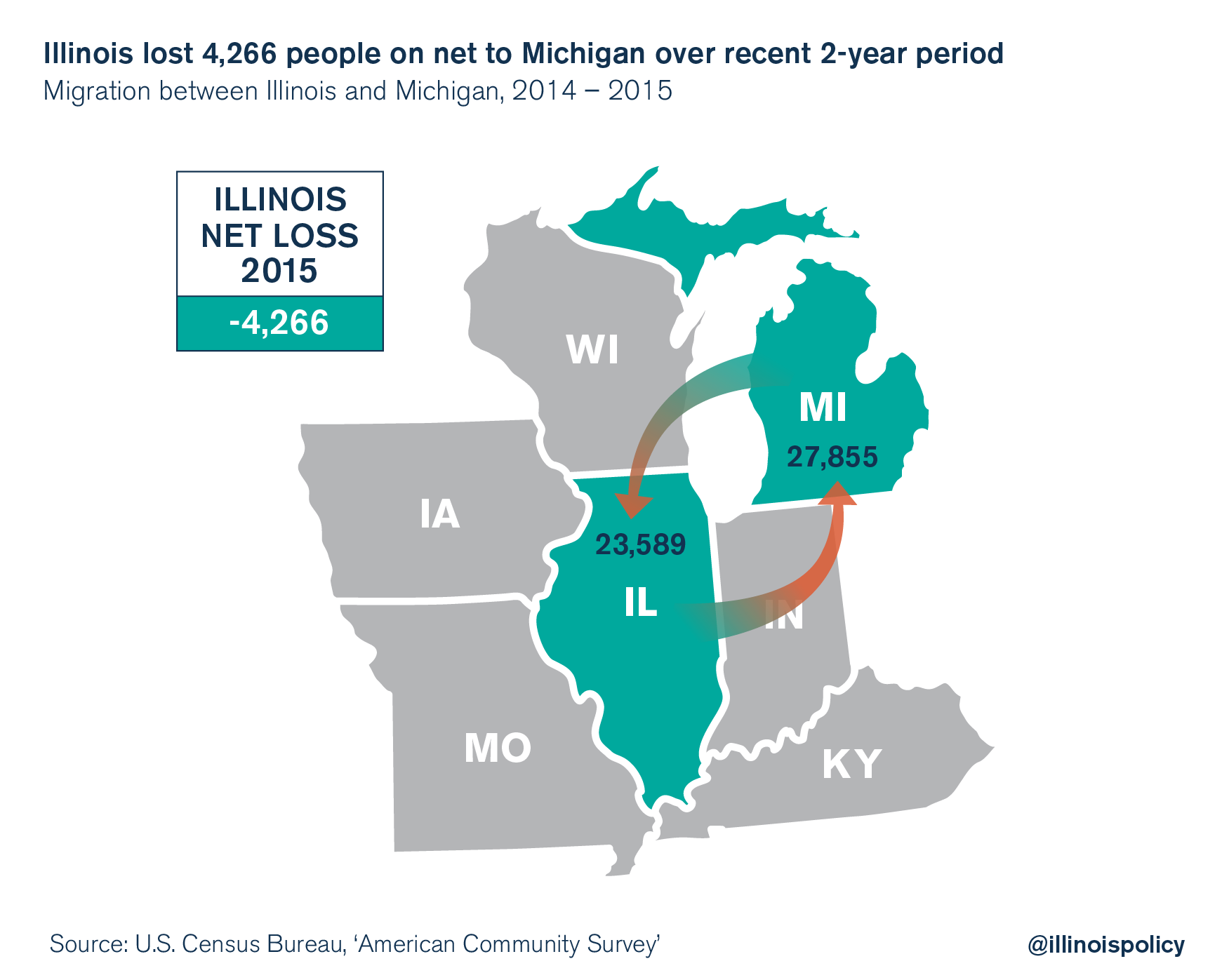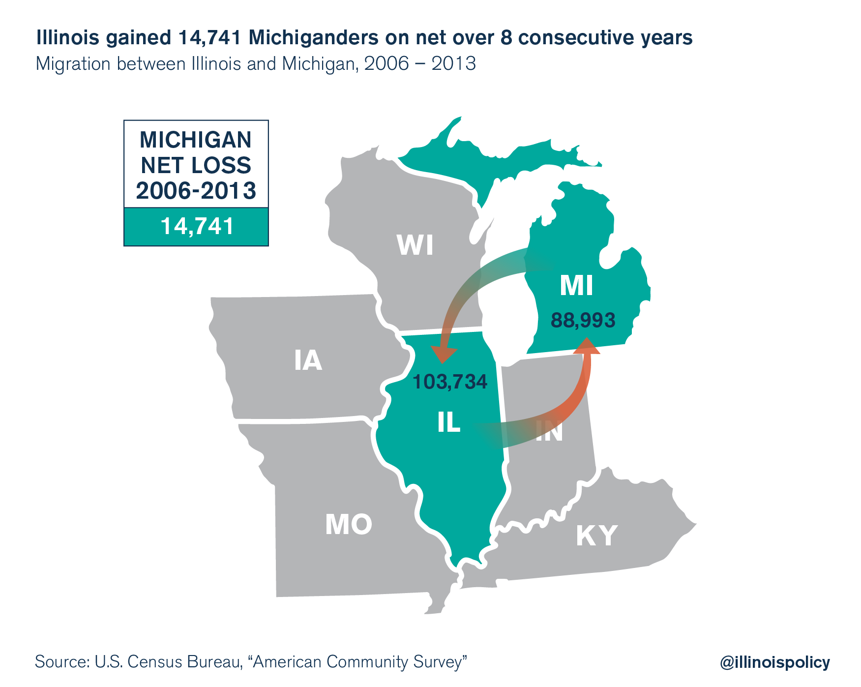 Illinois once enjoyed an annual population boost from Michigan. But in Illinois’ downward economic spiral, migration between Illinois and Michigan has tipped to favor the faster-growing Wolverine State.