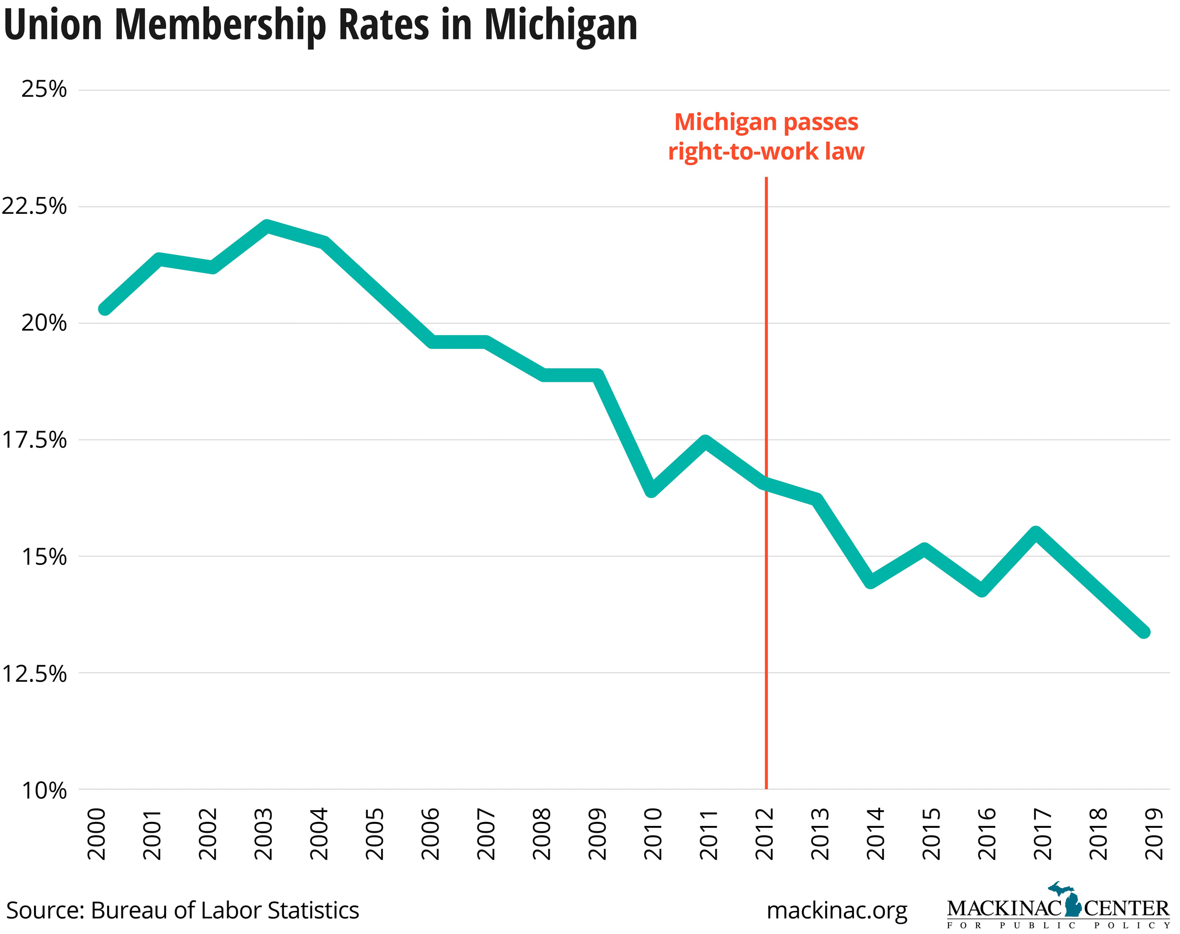 According to the U.S. Bureau of Labor Statistics, union membership in Michigan fell to an all-time low in 2019, reaching 13.6% of the workforce. This is down from 16.6% in 2013, the year Michigan’s right-to-work law went into effect.