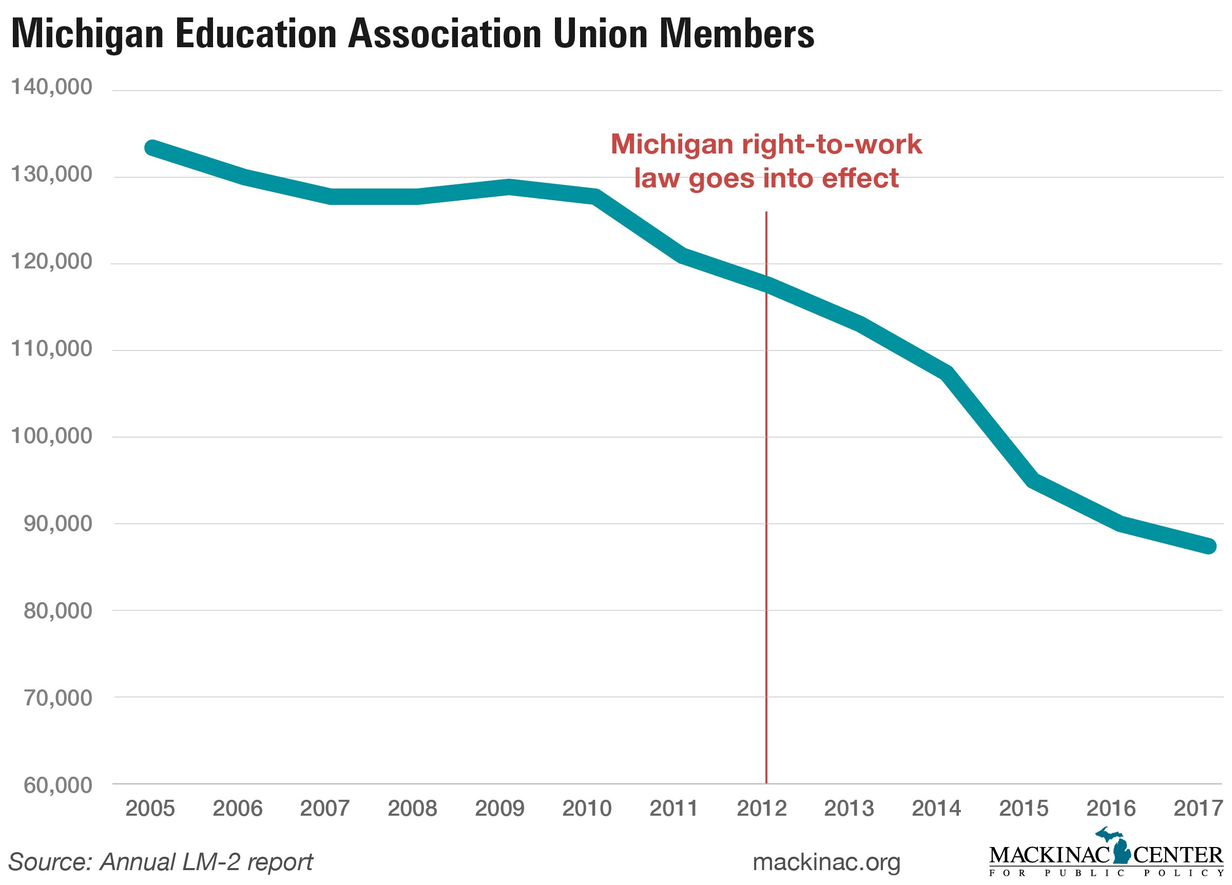 Right-to-work means employers cannot require employees to pay union dues as a condition of employment. Four years after this policy became law in Michigan, the MEA has lost 27,609 dues-paying members, according to the most recent union filings with the U.S. Labor Department, released this week.