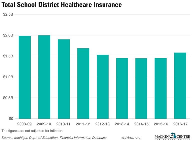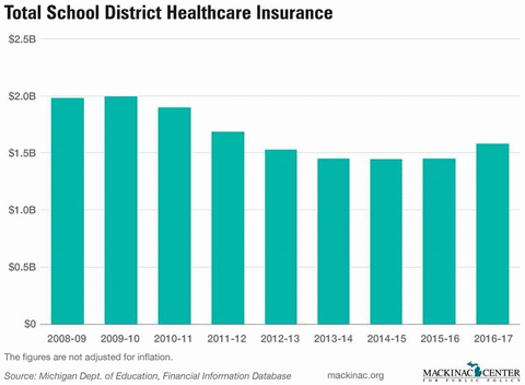 For the 2016-17 school year, public school districts spent a total of $1.6 billion on employee health insurance, according to the Michigan Department of Education. This is at least $50 million more than each of the previous four years. But it’s still $400 million less than the roughly $2.0 billion spent on health care costs for the 2009-10 school year.