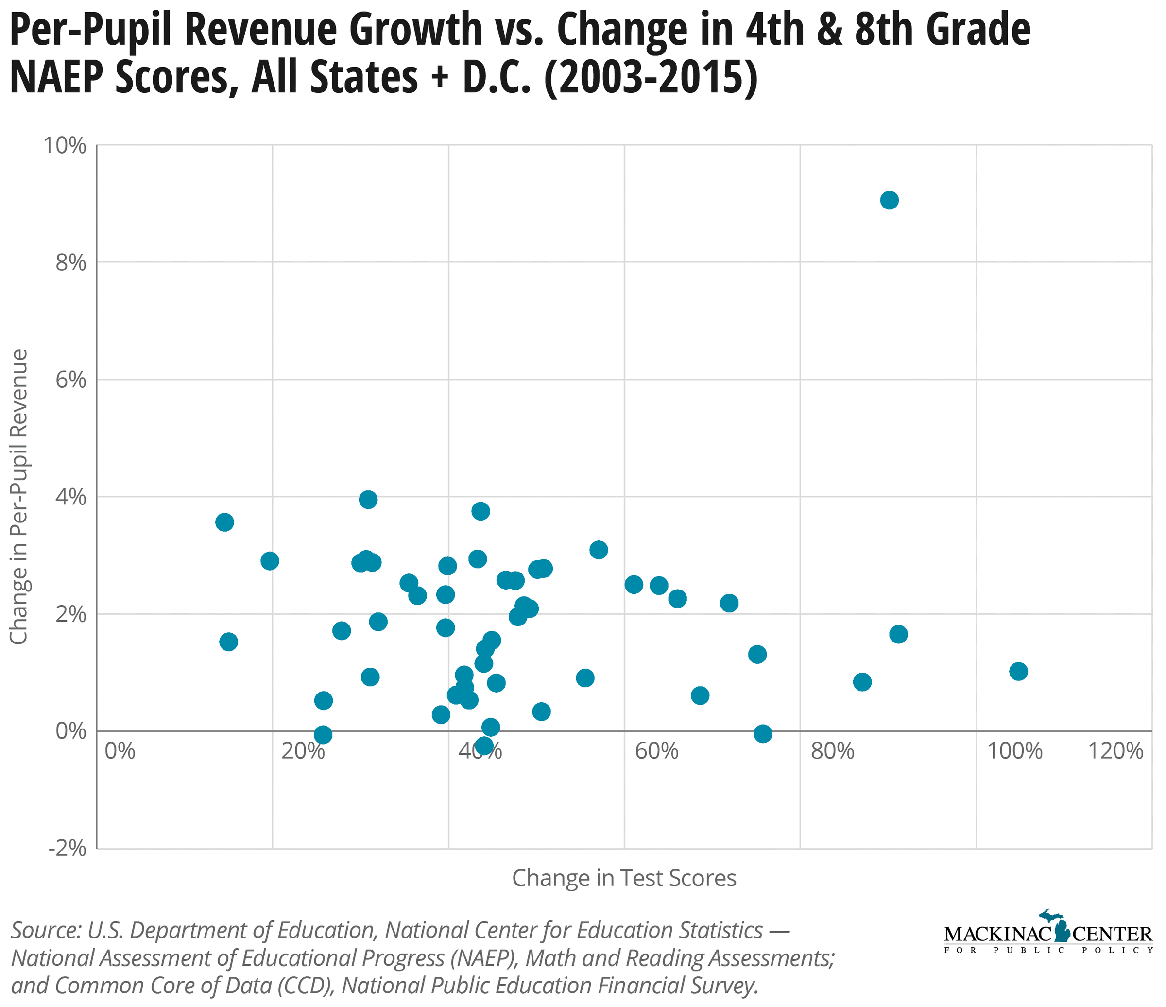 The conclusion of the MSU report closely ties together Michigan’s near-last progress on NAEP math and reading achievement with the allegation of near-last funding growth. However, the states that increased funding the most didn’t improve their test scores more than the states that didn’t boost funding as much. In fact, extra funding effort by a state doesn’t seem to have any clear relationship with its ability to boost educational outcomes. The following chart compares spending increases to test improvements on a state-by-state basis.