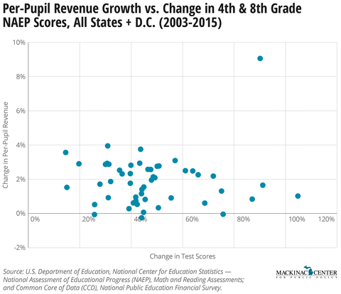 Six of the top 10 states that improved their average test scores on the NAEP the most were among the 11 states with the smallest funding growth. Conversely, New York made the same progress as Michigan while revenues grew by nearly $10,000 a student, a 76 percent increase in raw dollars. Michigan’s unadjusted funding growth over the period was 26 percent.