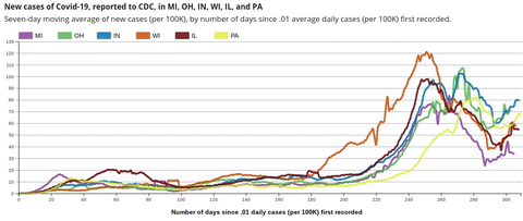 The chart below contains information from the Centers for Disease Control and Prevention, showing the number of daily confirmed new cases in Michigan and surrounding states. It does not show “uncontrolled growth” in any of these states.