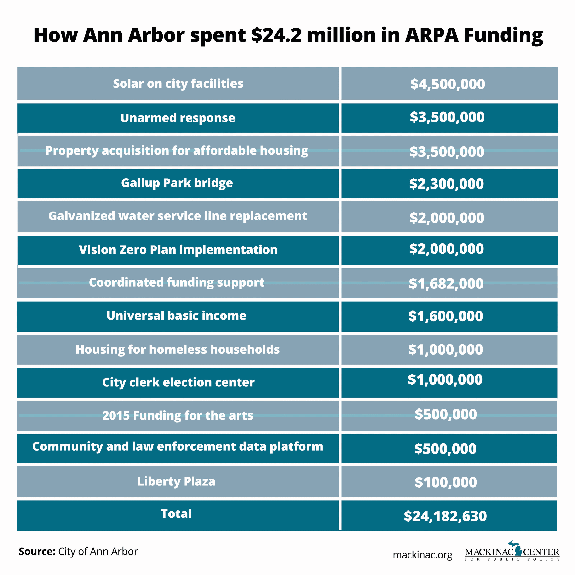 Ann Arbor spent $4.5 million of the $24 million it received through the American Rescue Plan Act on solar power infrastructure. It was the city’s largest allocation of the funds and listed in the category “Replacement of Lost Public Sector Revenue.”