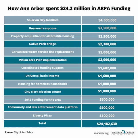 The city used funds in ways consistent with federal guidelines, Mariah Walton, Ann Arbor’s deputy city administrator, wrote to Michigan Capitol Confidential in an email. Federal rules “allowed local governments to use funds for general services if they experienced revenue shortfalls,” Walton added.