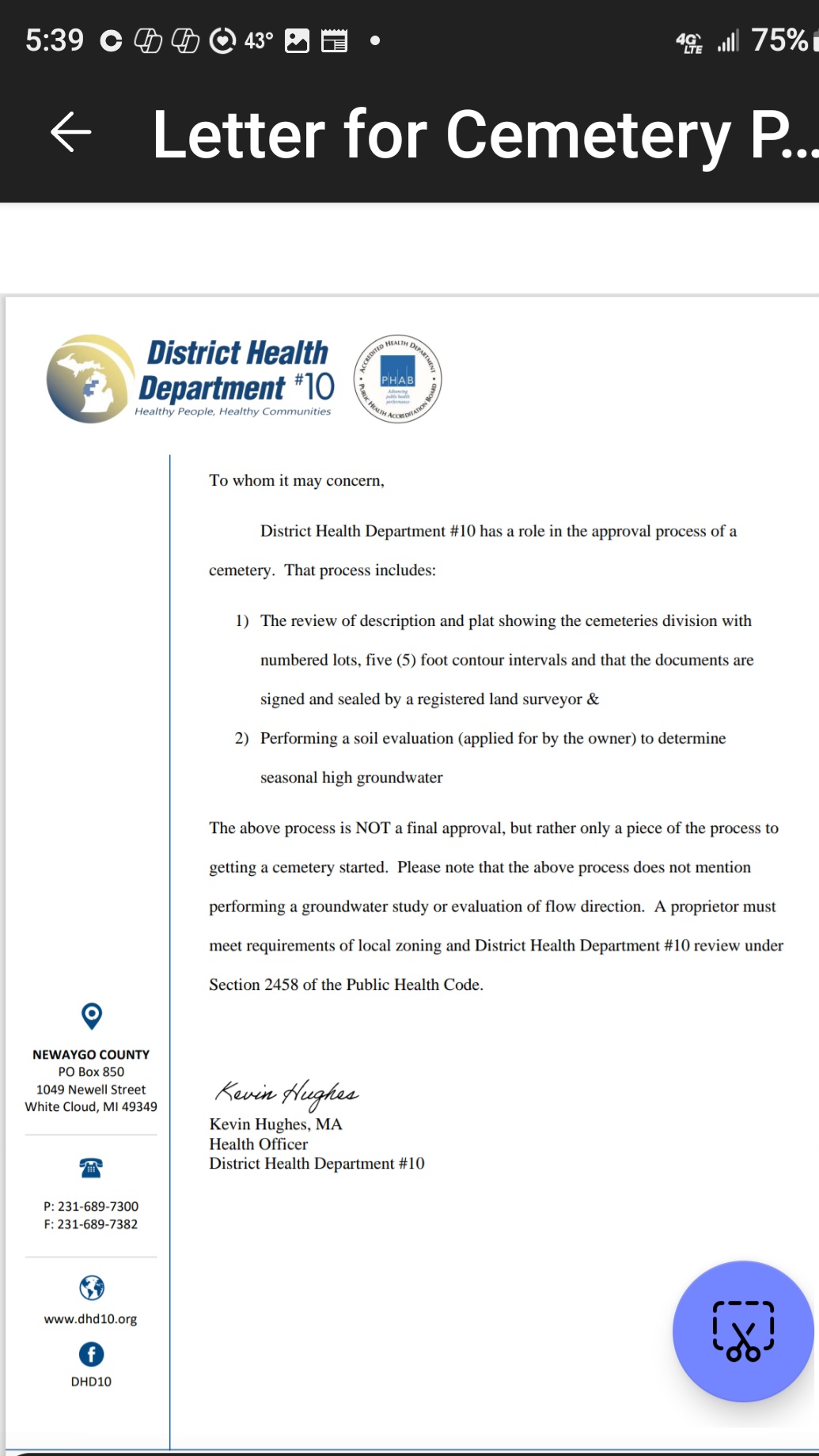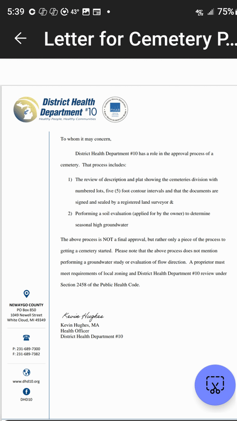 “The above process is NOT a final approval, but rather only a piece of the process to getting a cemetery started,” the letter said.
