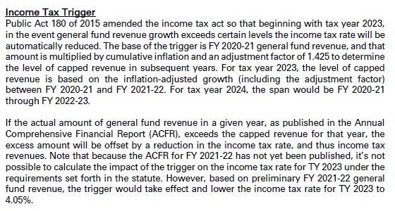 The trigger is expected to be reached, state officials predict. See this excerpt from the House Fiscal Agency’s revenue estimate for 2023: