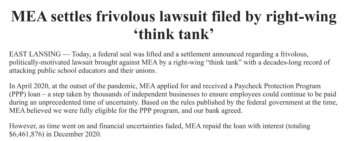 In January 2022, the Mackinac Center Legal Foundation sued the Michigan Education Association and its insurance affiliate, the Michigan Education Special Services Association. The foundation sued under the federal False Claims Act after both union entities improperly sought and were granted $12.5 million in COVID-19 relief money through the Paycheck Protection Program.